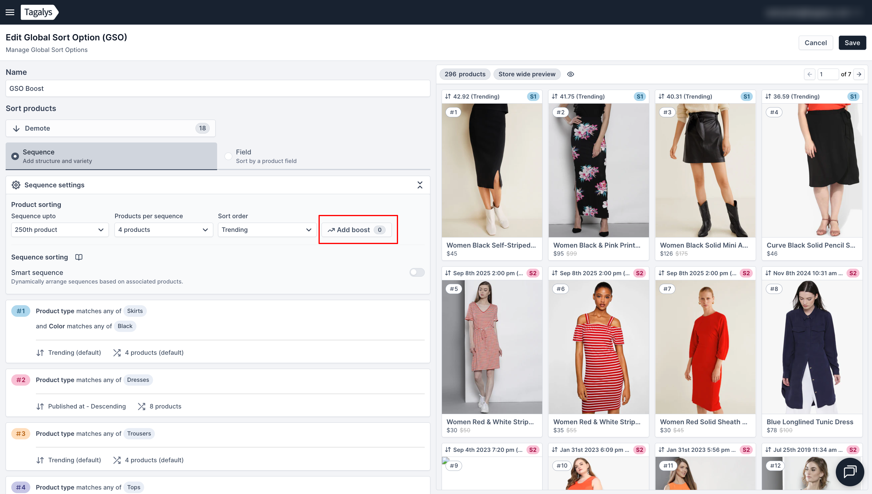 - Add one or more sequences with the 'Sort Order' set to 'Trending.' For instance, in this case, the first sequence is set to 'Match any' 'Skirts' in 'Black' within the Collection.