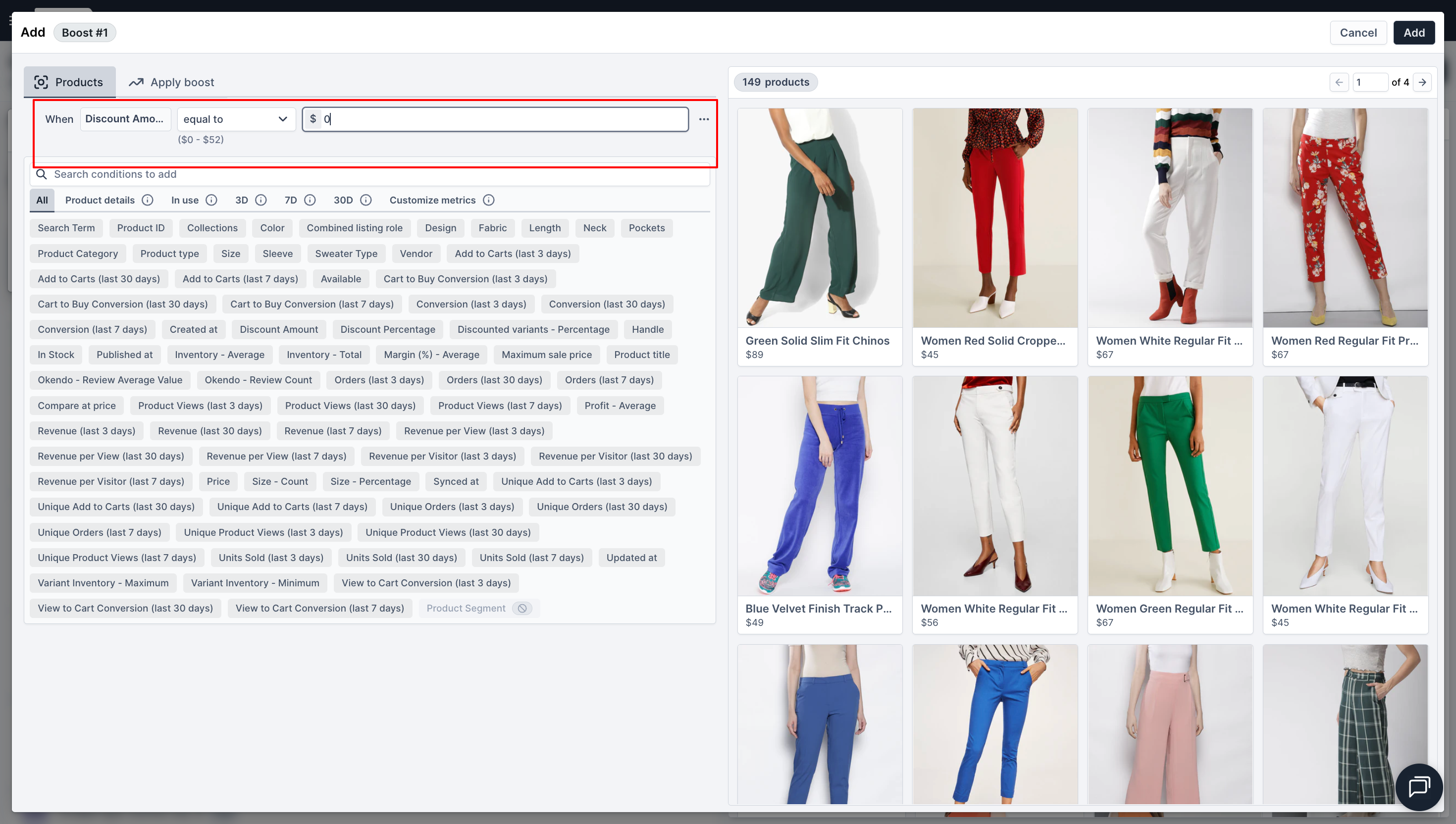 - Select the product attribute that you want to promote. For e.g., in this case, select 'Discount Amount' to 'Equal' to' '$0.'