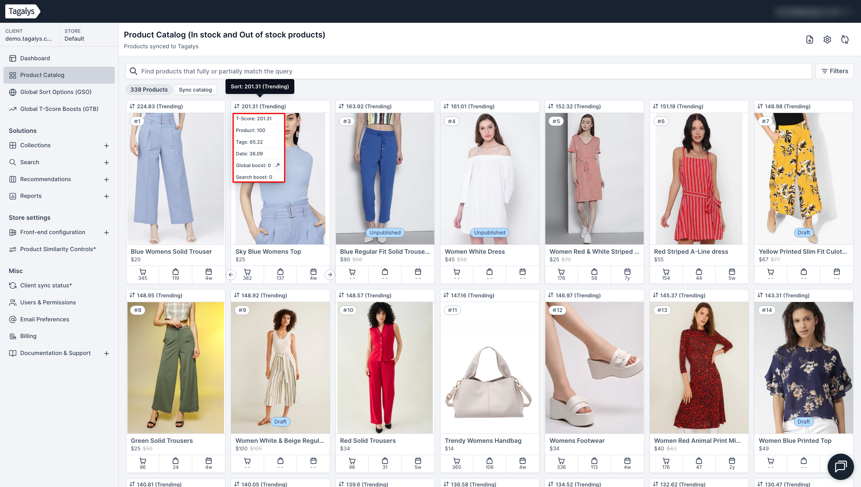 Tagalys automates the process of visual merchandising by assigning a score to each product every day, based on the previous 30 days of visitor engagement data. This analysis combines engagement data from our own analytics with product catalog data, to give both new and old products a normalized score every day.