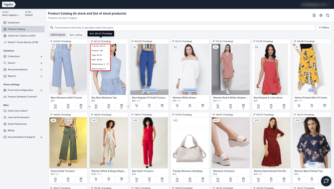 The T-score includes three components -‘Product Score, Tag Score, Date Score,’ which are based on visitor engagement data, and the merchant can influence the T Score using a 'Global Boost'